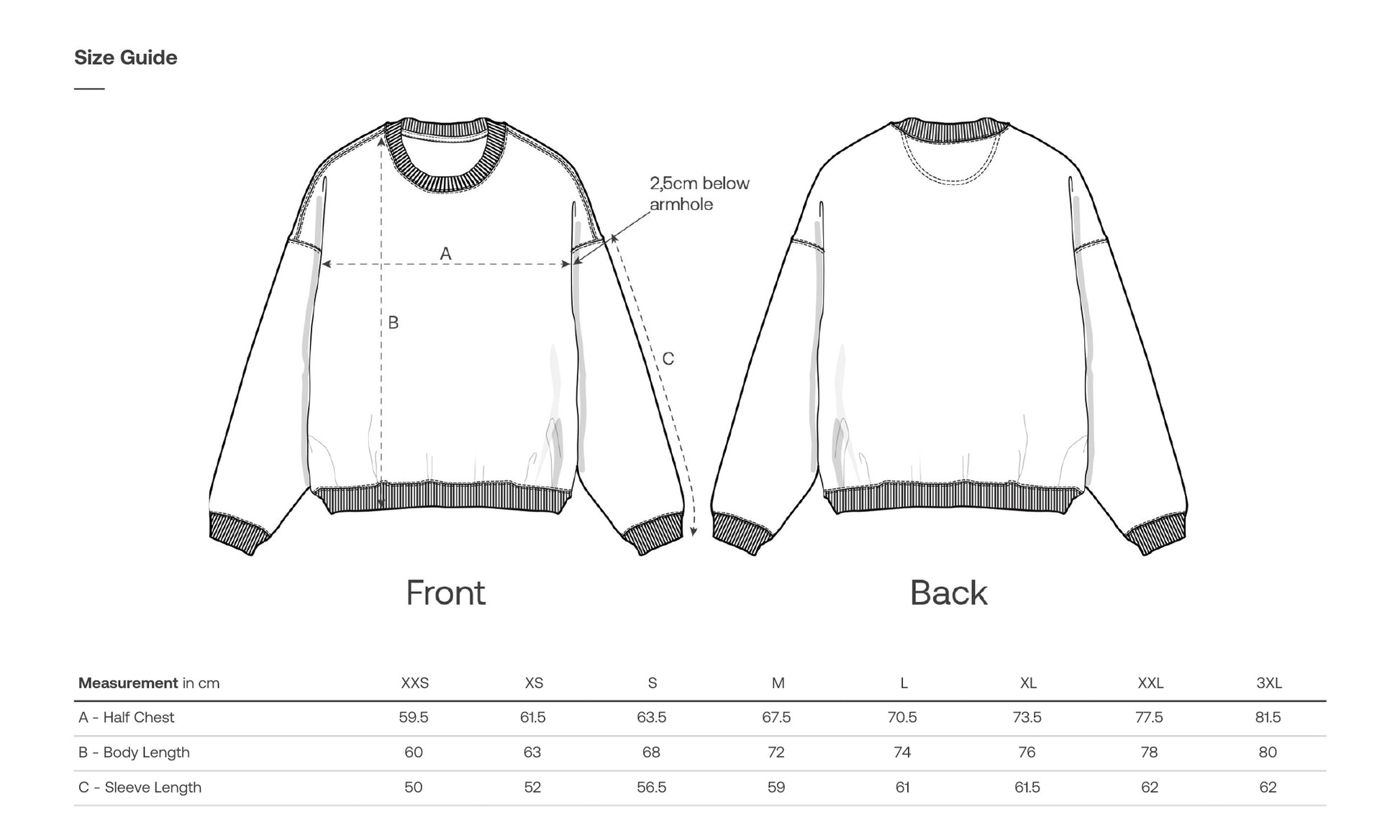 We recommend washing the sweater on the left side at 30 degrees and then air-drying it, this way the print will look nice forever! Very important: Iron on the left side and make sure you do never iron directly over the print.